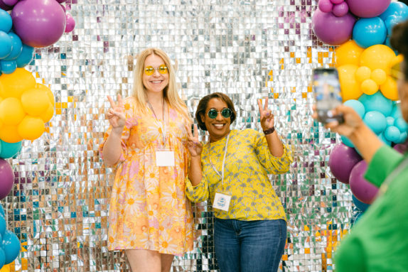 Two women are standing in front of a shimmering backdrop, smiling at the camera and holding up peace signs with their hands.