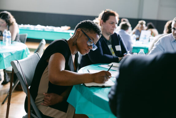 A woman is sitting at a table with others, looking down and writing on a piece of paper.