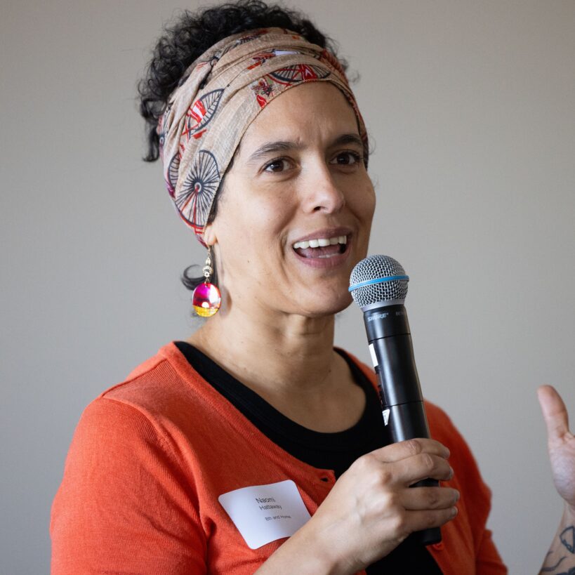 A close-up of a facilitator speaking with a microphone.