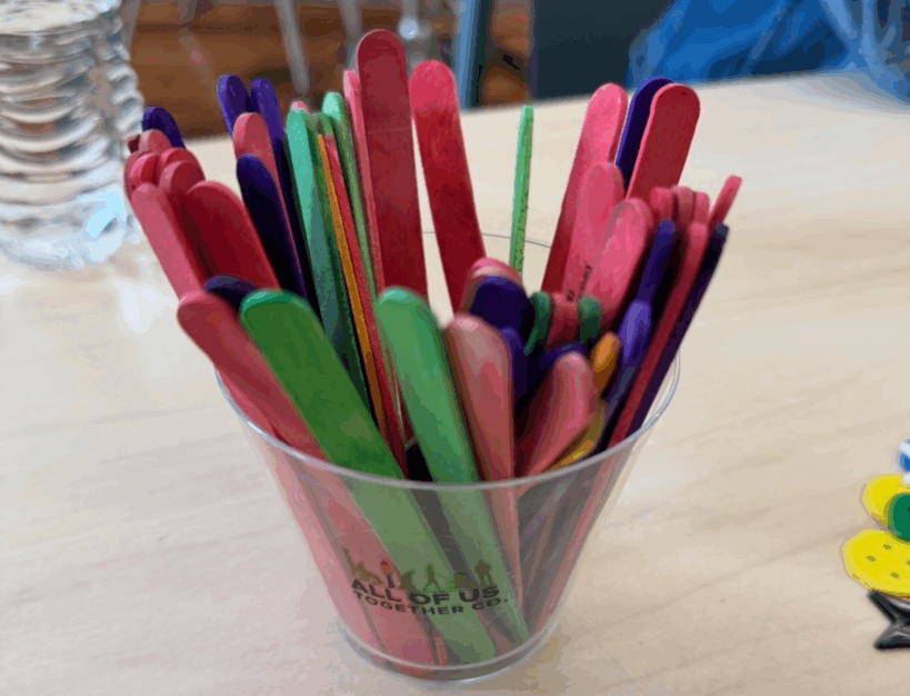 Popsicle sticks in various colors in a clear cup with All of Us Together Co.'s name and logo on it.